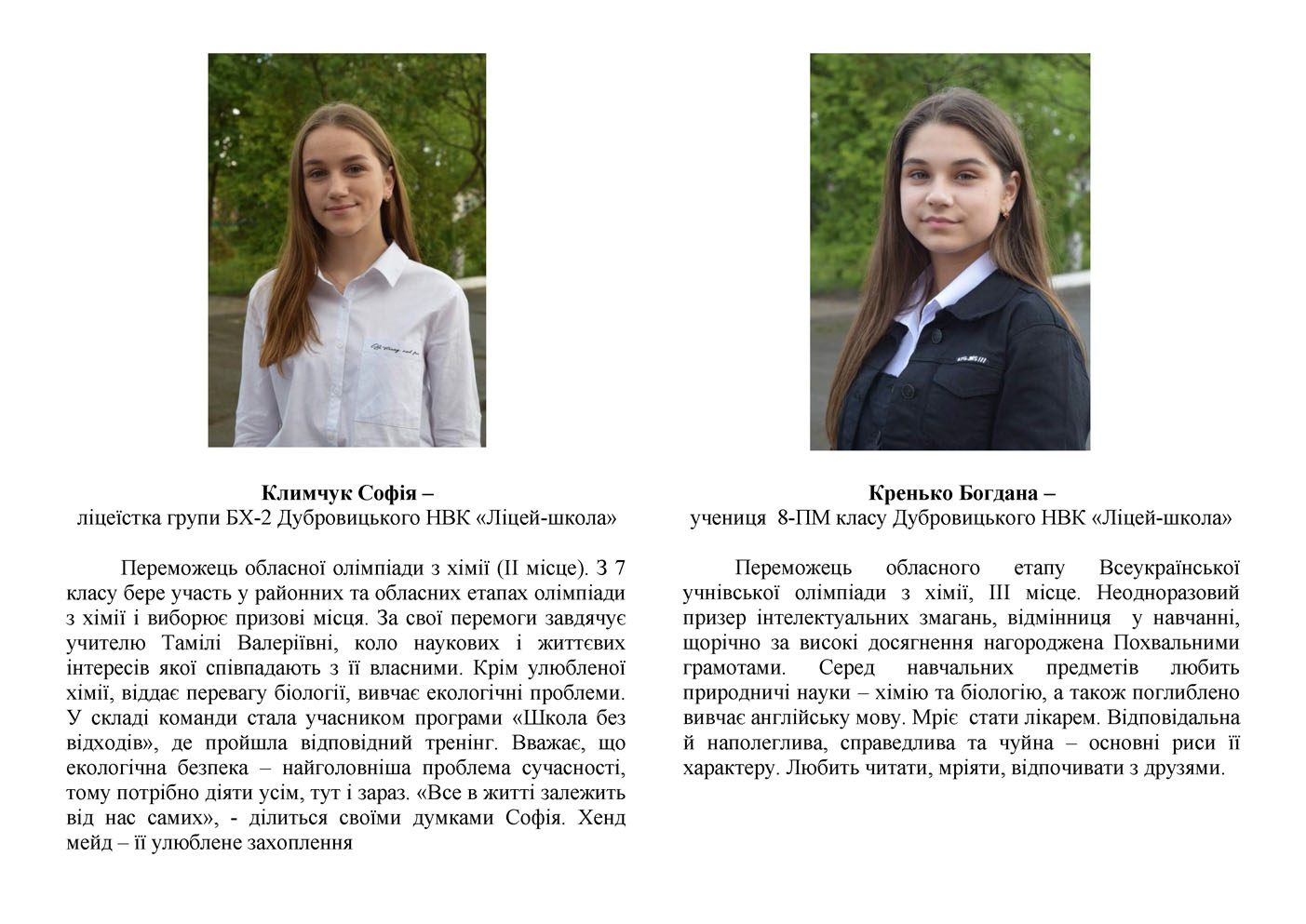 Дубровицького навчально-виховного комплексу «Ліцей –школа», яка виборола 18 призових місць в обласних олімпіадах : 7других : Кушнір Олександр з інформатики та фізики, Петровець Іван з інформатики та з інформаційних технологій, Коржик Андрій з інформаційних технологій, Швед Анастасія та Климчук Софія з хімії; 11 третіх : Гайдиш Владислав з інформатики, Черпак Іван з історії, Колода Яна та Дубінець Яна з української мови та літератури, Швед Анастасія з біології та з екології, Кренько Назарій з англійської мови, Делідон Ірина з екології та хімії, Мосійчук Микола та Кренько Богдана з хімії ;
