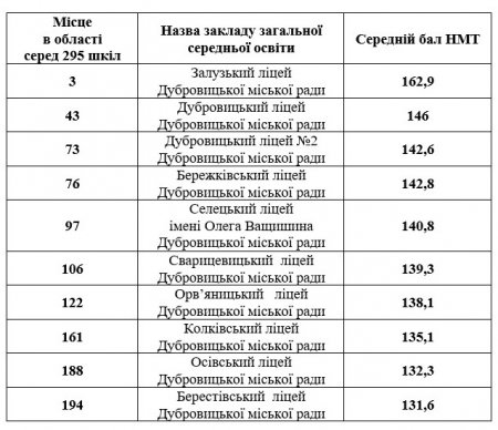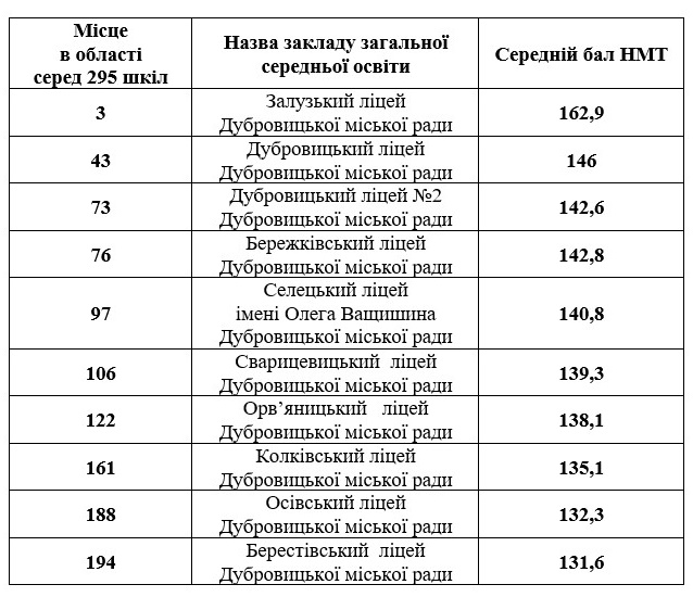 Рейтинг ліцеїв Дубровицької міської ради за результатами НМТ 2025 року